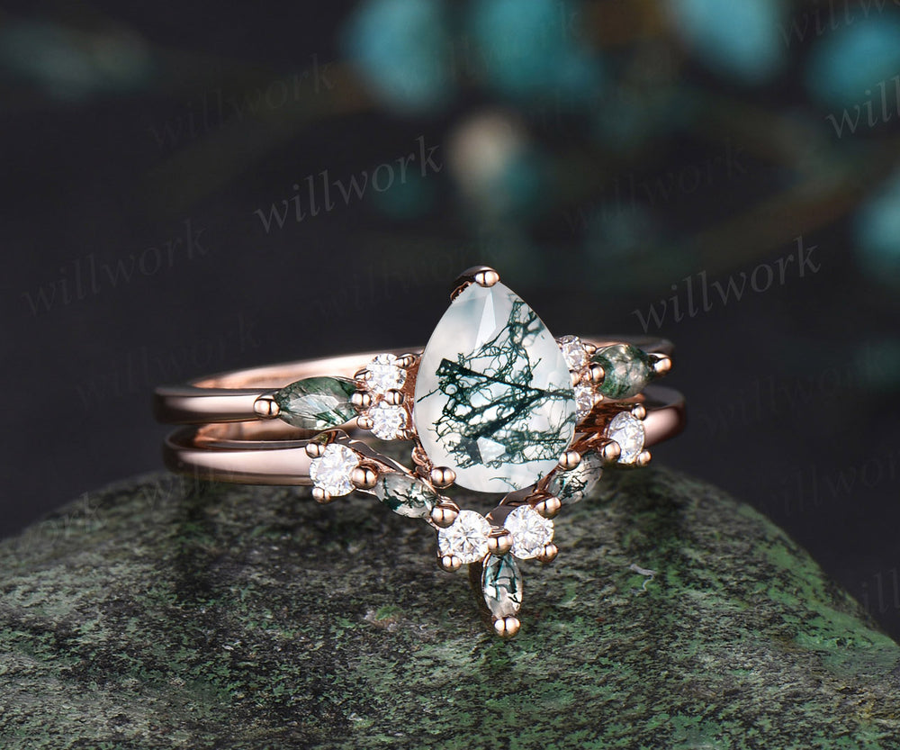 Pear cut moss agate engagement ring set vintage rose gold dainty diamond ring women unique wedding bridal ring set jewelry