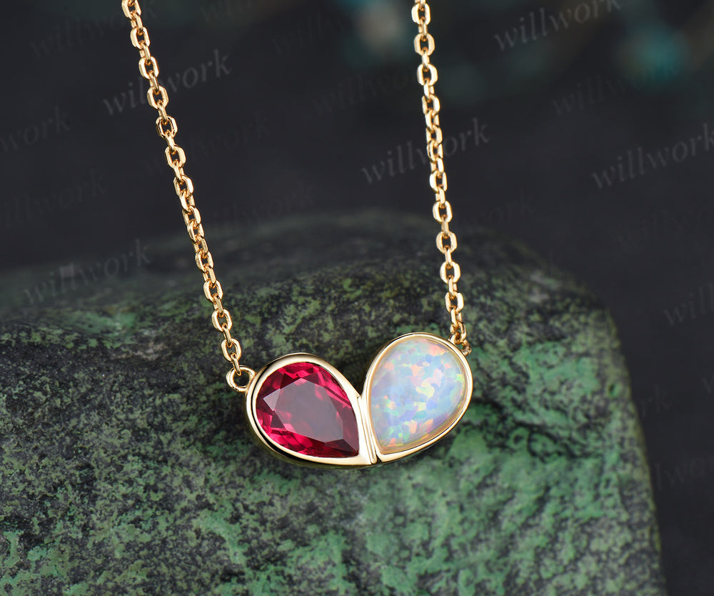 Pear ruby opal necklace heart shape bezel pendant Toi et Moi necklace minimalist yellow gold jewelry