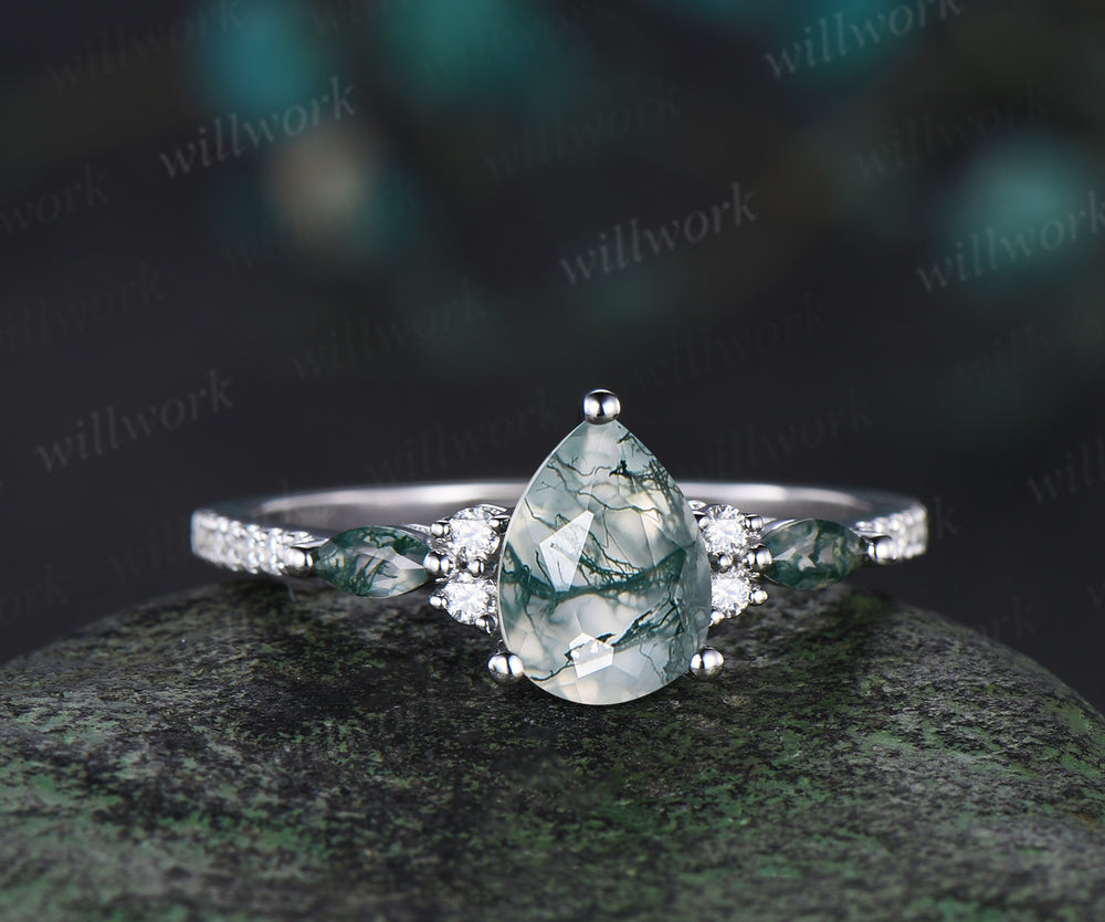 Pear shaped natural moss agate engagement ring women vintage solid 14k white gold half eternity diamond wedding anniversary gift
