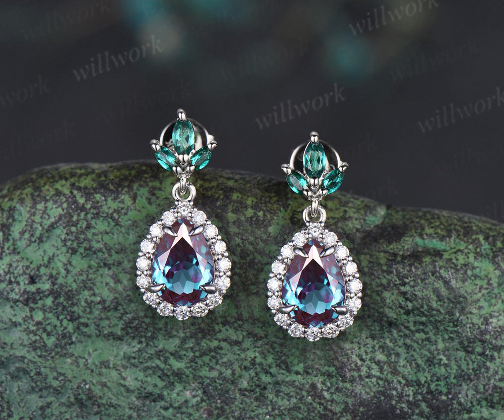 Pear teardrop cut Alexandrite earrings solid 14k white gold vintage leaf marquise emerald drop earrings women anniversary gift jewelry