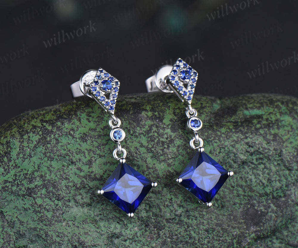 Princess cut blue sapphire earrings 14k white gold kite halo sapphire drop earrings women September birthstone anniversary gift for her Princess cut blue sapphire earrings 14k white gold kite halo sapphire drop earrings women September birthstone anniversary gift for her $298.00