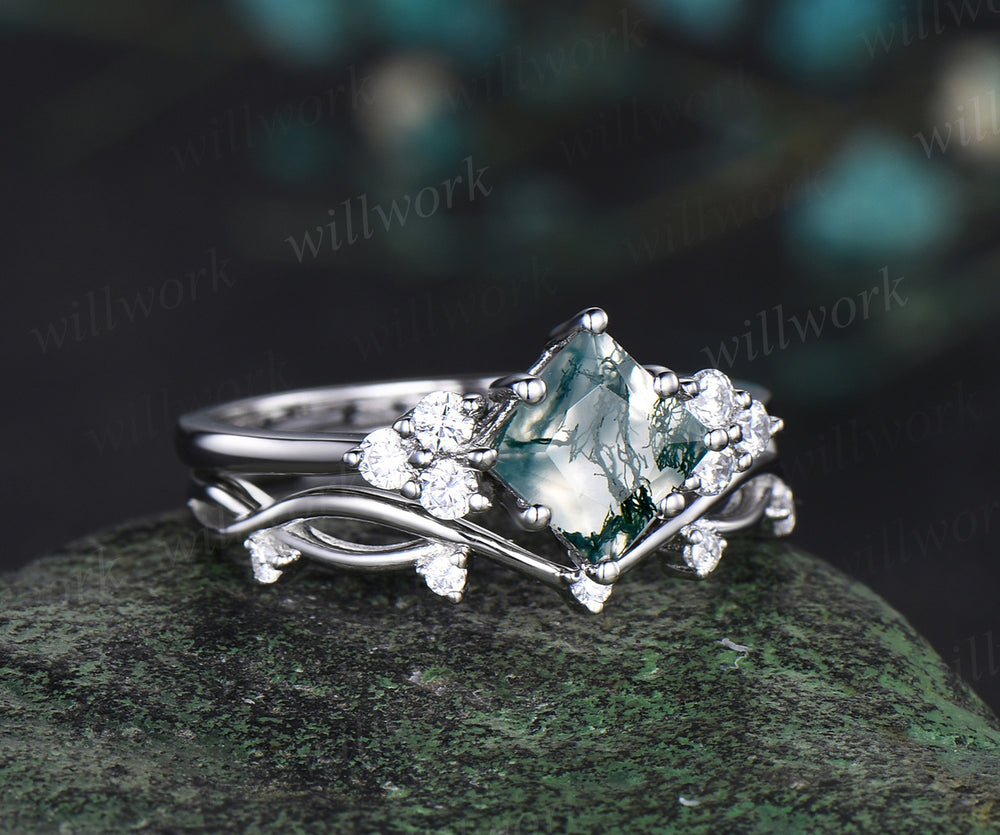 Princess cut green moss agate engagement ring set white gold 8 prong dainty Minimalist diamond ring women infinity anniversary gift