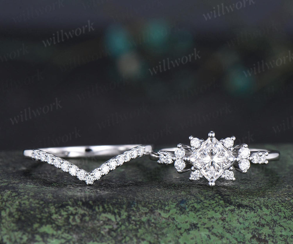 Princess cut lab grown diamond ring white gold cluster unique engagement ring set stacking moissanite bridal promise ring set women