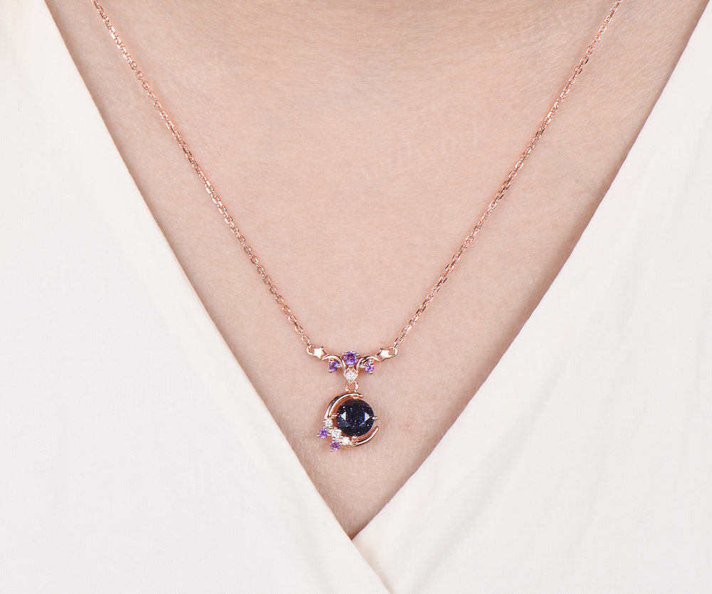 ***A galaxy you can wear?athis celestial necklace features a round blue sandstone as the night sky, with shimmering amethyst and moissanite star clusters dancing around a dreamy moon. A magical gift for stargazers, dreamers, and lovers of the cosmos.***- Metal: Solid gold(9K/14K/18K white/yellow/rose gold),925 sterling silver, platinum available