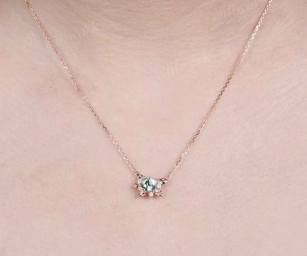Round moss agate leaf pendant necklace nature inspired moissanite rose gold necklace birthday anniversary gifts