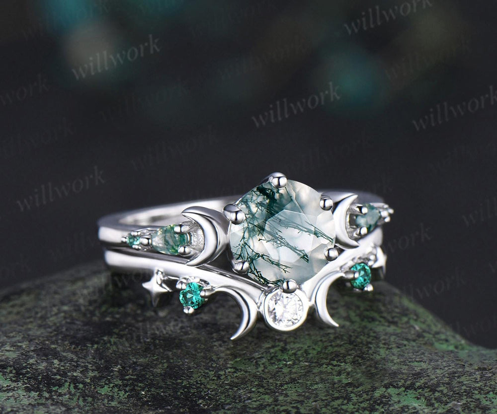 Round natural moss agate ring vintage white gold moon five stone unique engagement ring emerald bezel sun star ring jewelry
