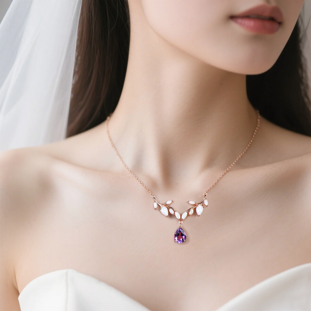 ***Graceful and enchanting, this teardrop amethyst leaf necklace features a vibrant purple amethyst delicately suspended from marquise-cut opal leaves on a rose gold twig design. Inspired by nature, the necklace blends crystal brilliance with organic elegance, making it a unique jewelry gift for weddings, anniversaries, or special occasions.***- Metal: Solid gold(9K/14K/18K white/yellow/rose gold),925 sterling silver, platinum available