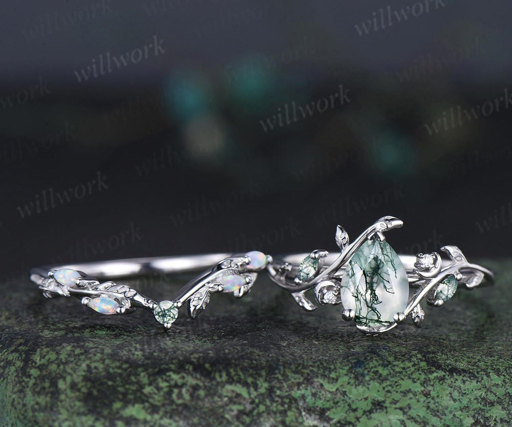 Teardrop pear cut moss agate ring vintage white gold leaf moon engagement ring set nature inspired marquise opal wedding ring silver
