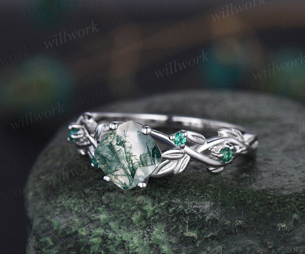 Twig cushion cut green moss agate engagement ring 14k white gold five stone emerald ring vintage retro gemstone leaf wedding ring women gift