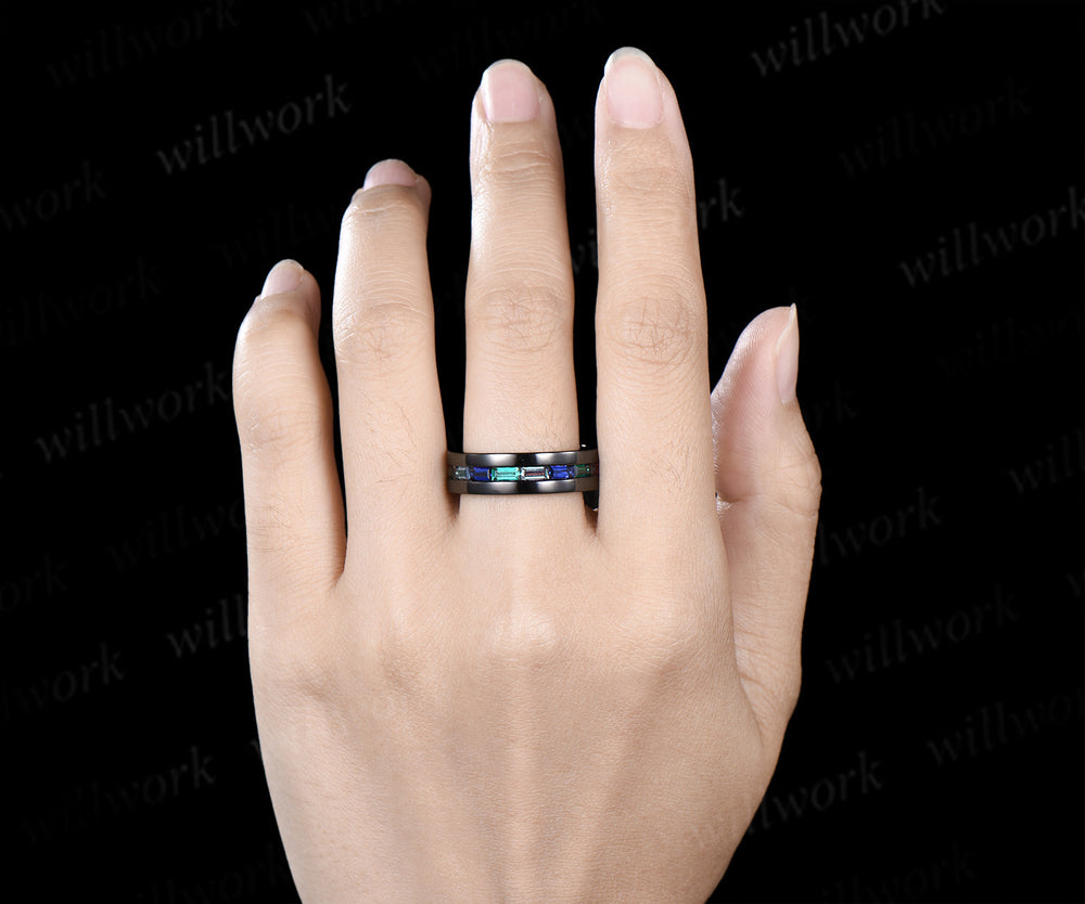 Unique baguette cut emerald sapphire alexandrite men ring black gold half eternity mens wedding band anniversary gifts Unique baguette cut emerald sapphire alexandrite men ring black gold half eternity mens wedding band anniversary gifts $335.00