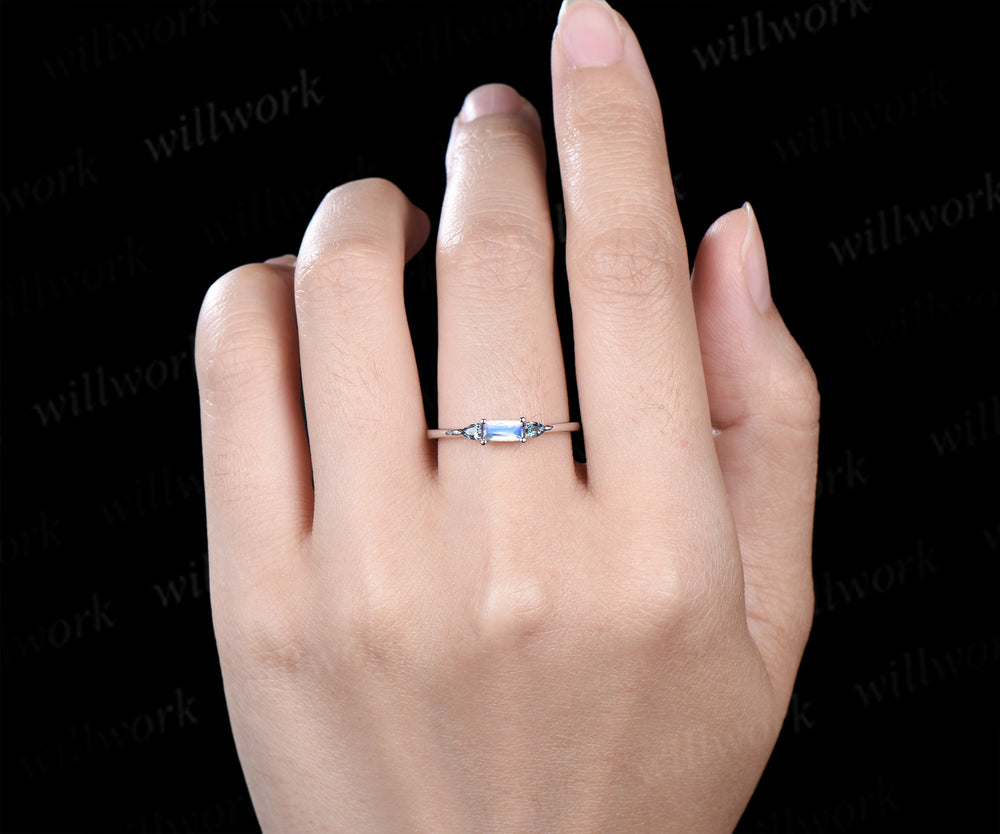 Unique baguette cut moonstone ring pear alexandrite wedding band soild 14k white gold June birthstone ring for women