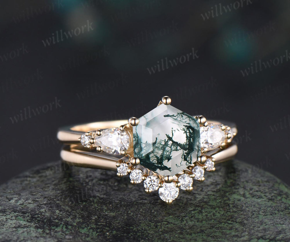Unique hexagon cut moss agate engagement ring set five stone moissanite yellow gold ring women stackable promise ring her gift