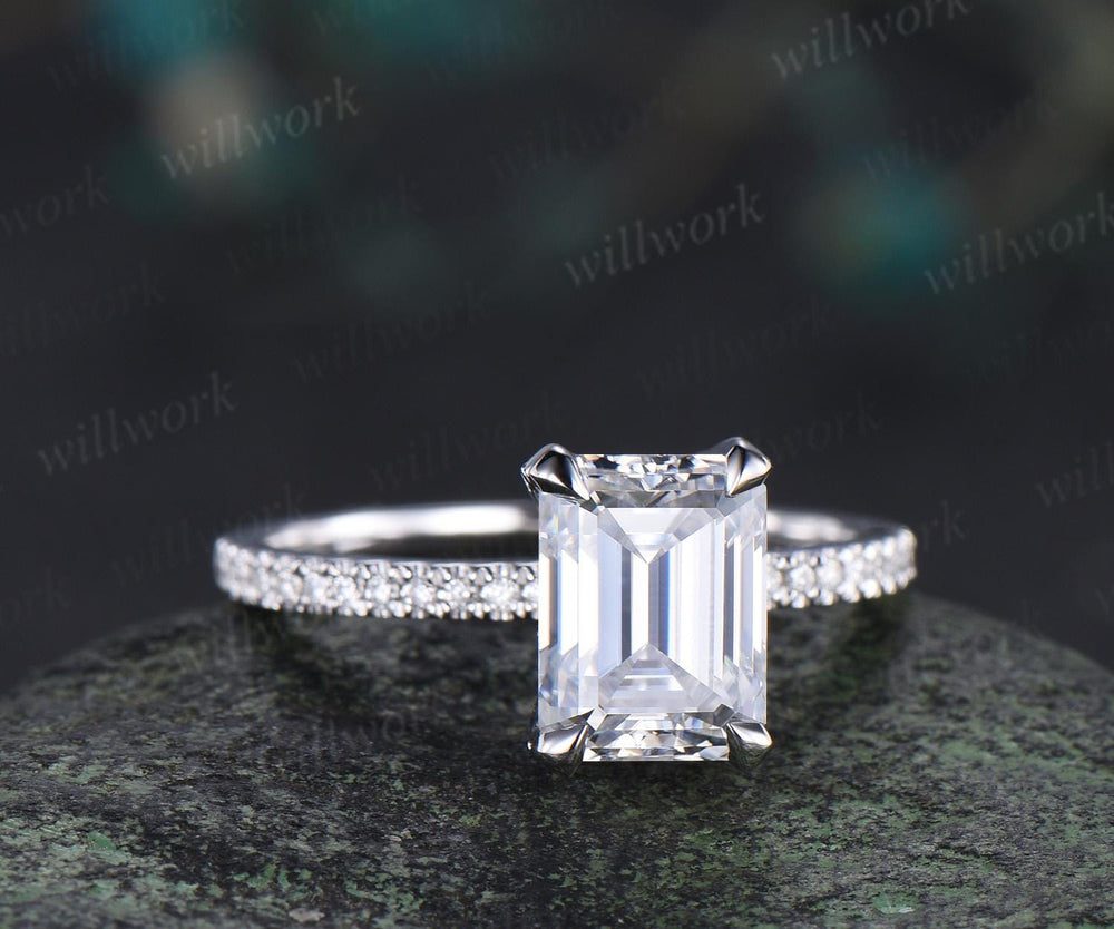 Vintage emerald cut lab grown diamond engagement ring 14k white gold engagement ring hidden halo unique promise wedding ring women jewelry