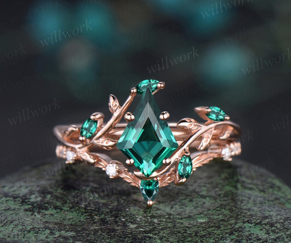 Vintage kite cut green emerald engagement ring set solid 14k yellow gold cluster leaf nature inspired moissanite bridal ring set women gift