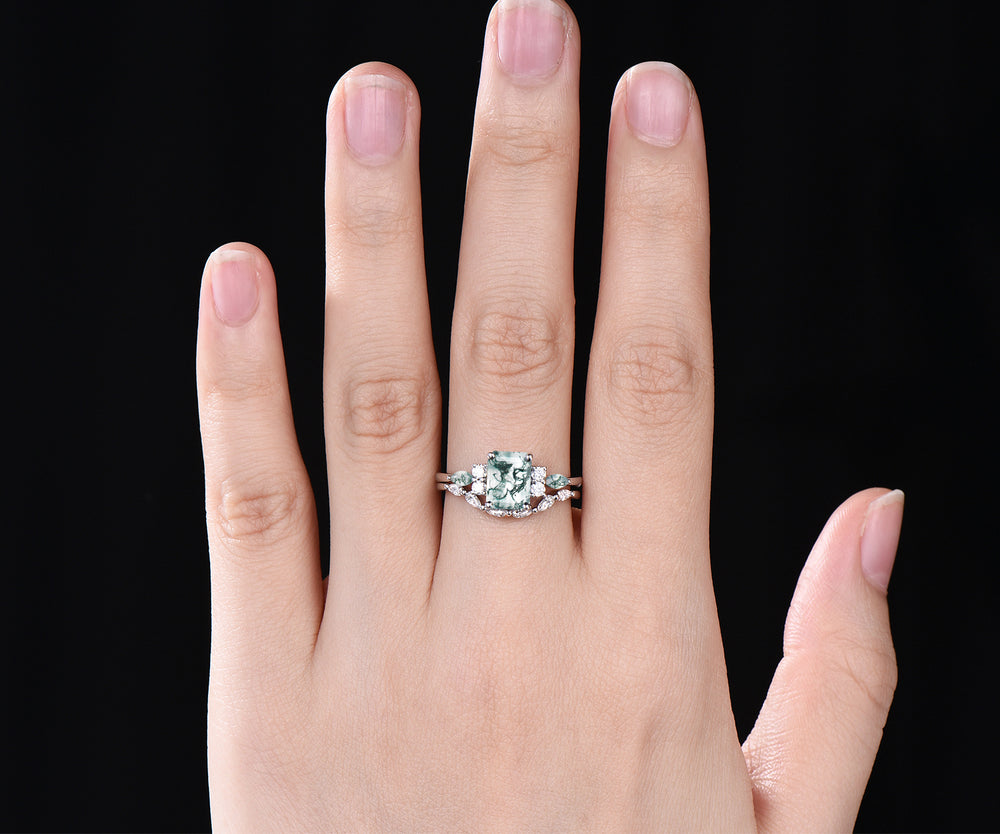 Vintage moss agate ring set emerald cut moss agate engagement ring curved moissanites wedding band proposal promise ring anniversary gifts