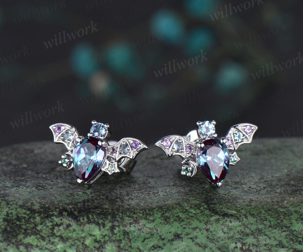 Vintage pear alexandrite bat stud earrings rose gold moon unique earrings emerald amethyst anniversary gift women