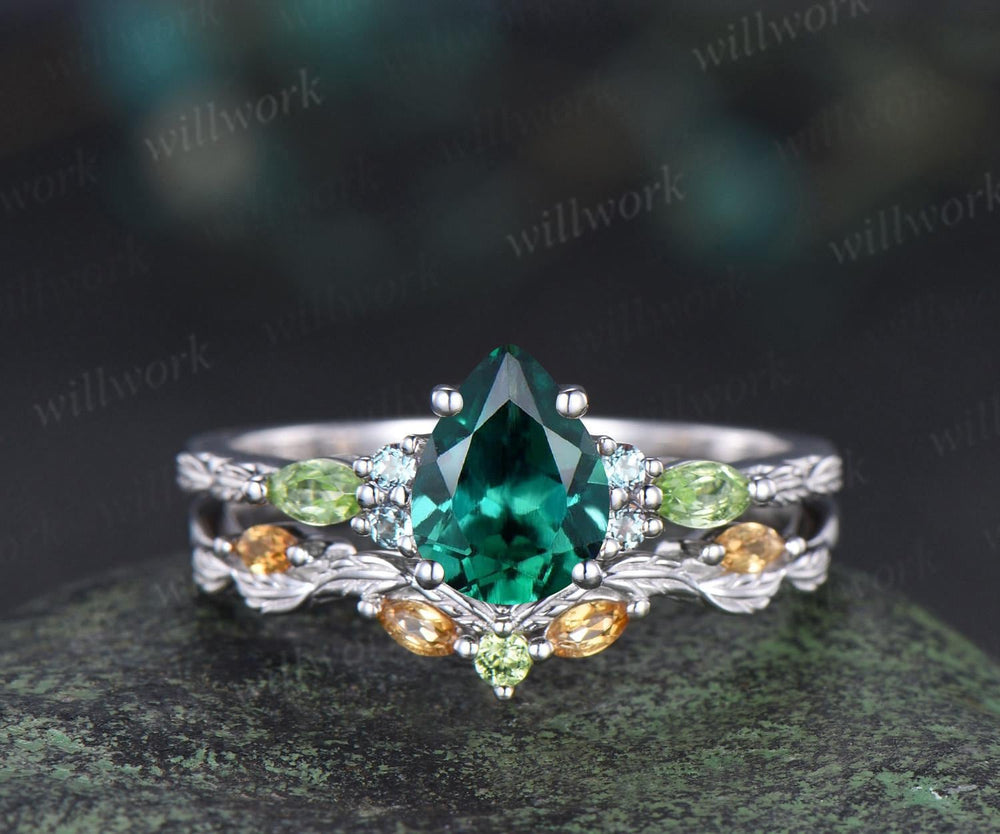 Vintage pear green emerald engagement ring set solid 14k white gold alexandrite peridot citrine art deco leaf wedding ring set women