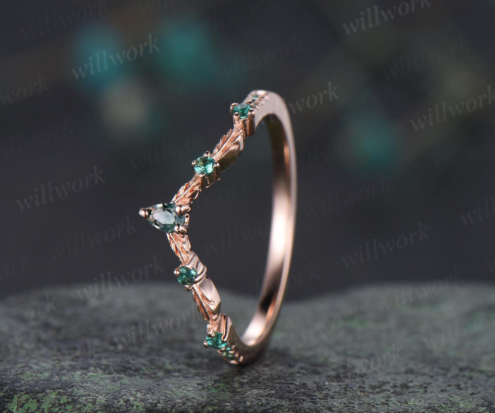 Vintage pear moss agate emerald wedding band solid 14k rose gold art deco leaf nature inspired stacking bridal anniversary ring women gift