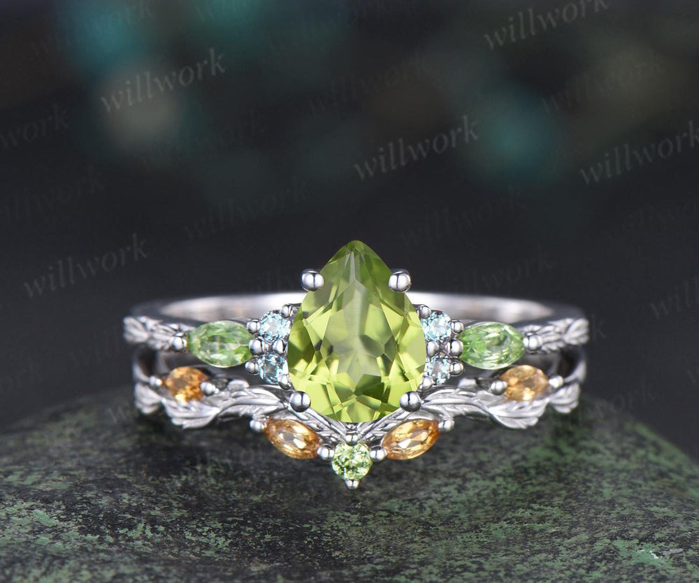 Vintage pear peridot engagement ring set solid 14k white gold alexandrite citrine art deco leaf wedding ring set women silver