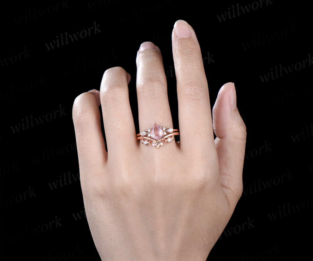 Vintage pear rose quartz engagement ring moissanite seven stone ring moon trinity opal matching band unique bridal set