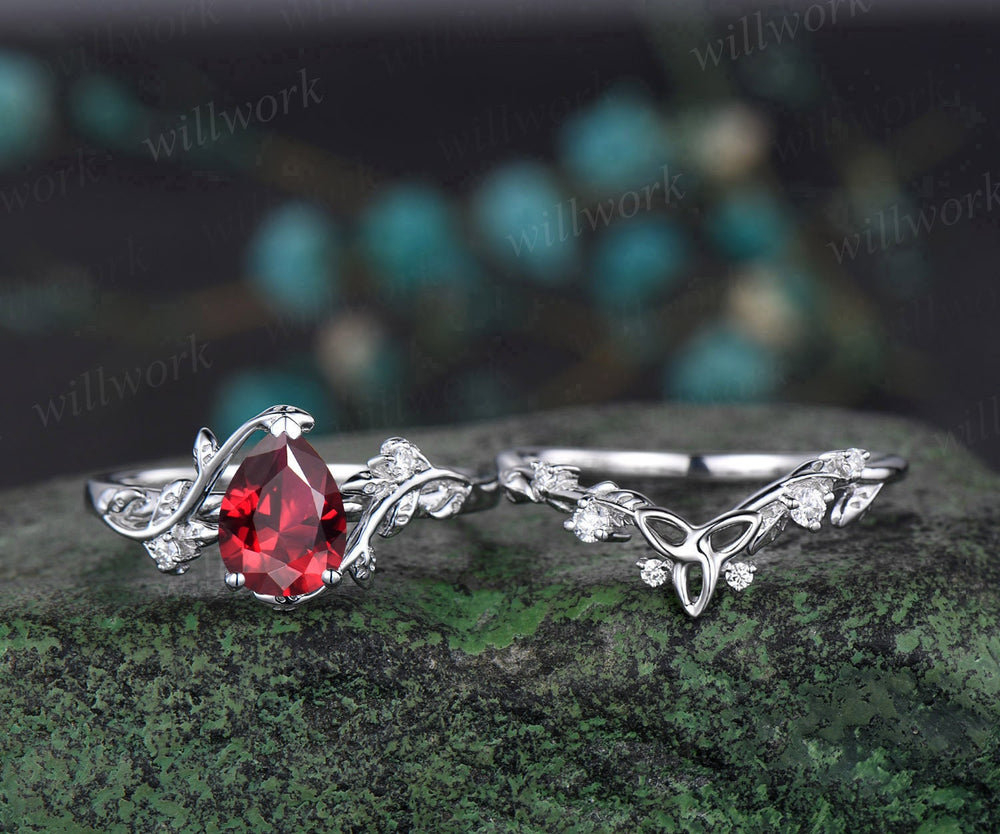 Vintage Pear shaped red ruby engagement ring white gold leaf branch diamond bridal ring set Celtic knot wedding ring band women jewelry
