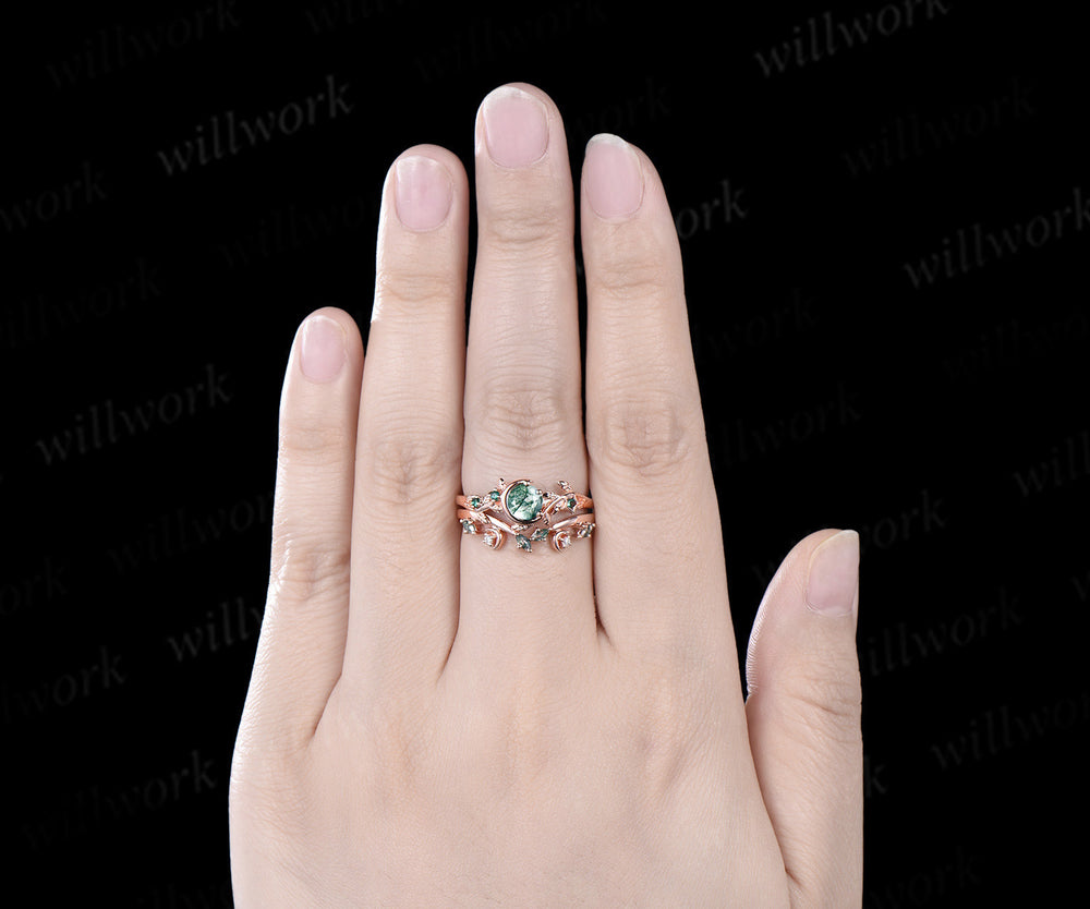 Vintage round cut green moss agate engagement ring rose gold leaf star emerald ring women moon wedding band stacking bridal set