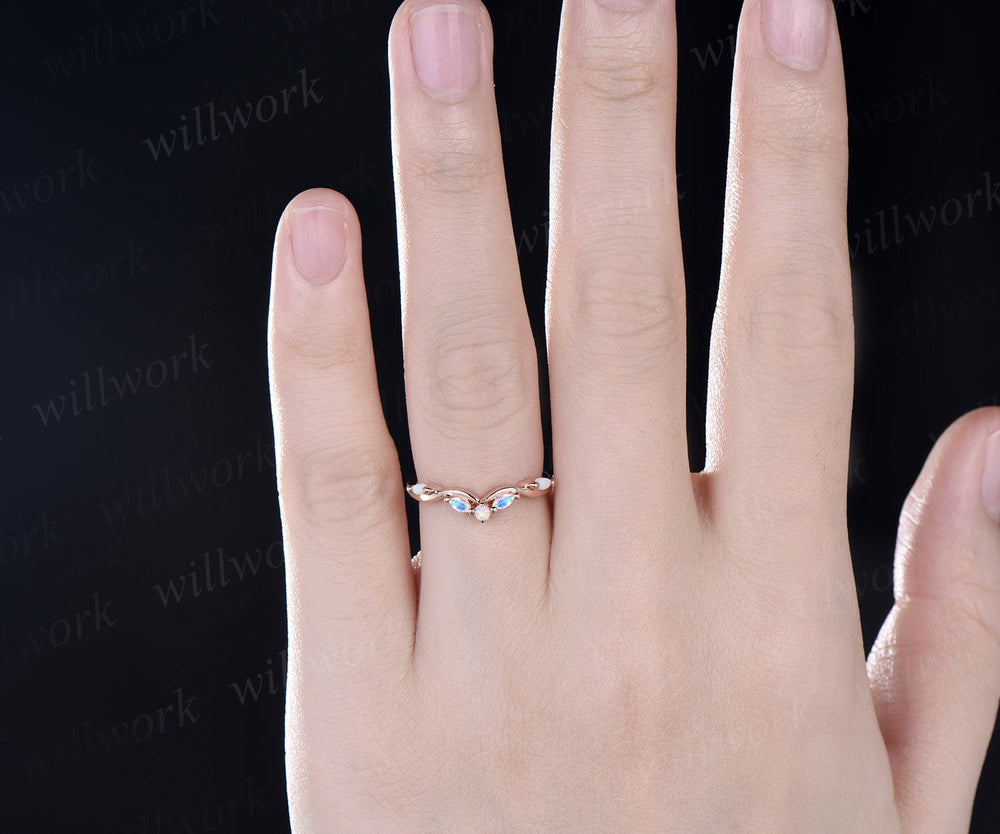Vintage Curved moonstone opal wedding band 14k rose gold art deco stacking wedding ring band women birthstone anniversary ring gift