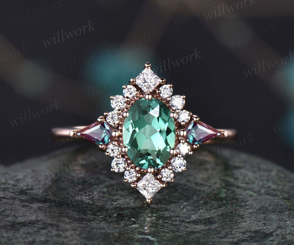 Vintage oval teal green sapphire engagement ring 14k gold halo princess cut diamond ring kite alexandrite ring women retro anniversary ring