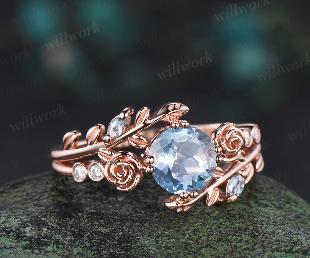 Unique round aquamarine engagement ring floral leaf diamond ring women rose gold nature inspired promise ring her gift