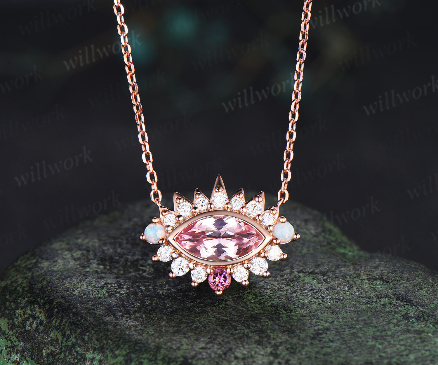 ***Radiating warm sunrise hues, this marquise Padparadscha pink sapphire necklace glows with a halo of sparkling moissanites and iridescent opal accents. Featuring a pendant with a delicate evil-eye motif, it blends romantic elegance, whimsical charm, and protective talisman magic for statement jewelry lovers.***- Metal: Solid gold(9K/14K/18K white/yellow/rose gold),925 sterling silver, platinum available