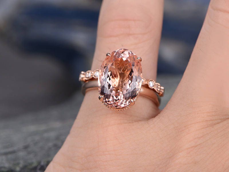 11x14mm pink morganite engagement ring handmade solid 14k rose gold wedding ring real marquise diamond band promise ring 2pc bridal ring set
