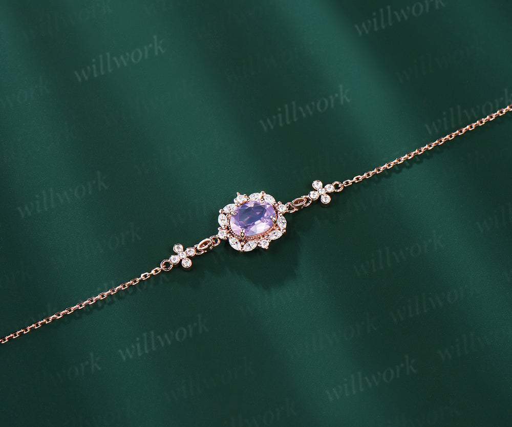 14K Real Rose Gold Oval Lavender Amethyst & Diamond Chain Bracelets Dainty Simple Genuine Gemstone Crystal Charm Wedding Bracelet for Bridal
