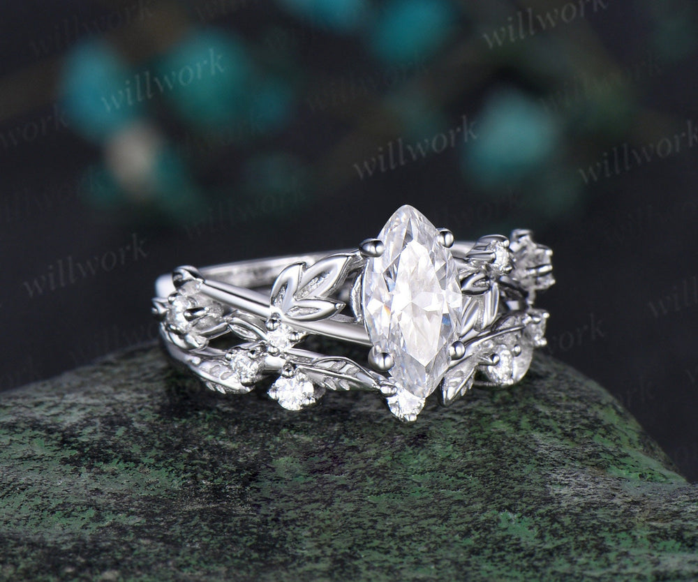 1ct marquise cut moissanite engagement ring set solid 14k white gold twig leaf stacking diamond wedding ring set women jewelry