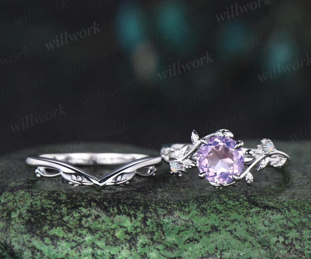 1ct round cut Lavender Amethyst engagement ring vintage branch opal ring white gold stacking leaf wedding ring band women crystal ring