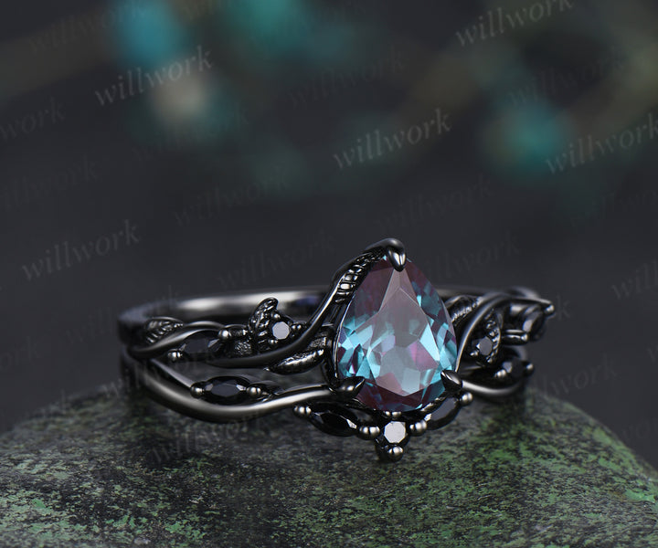 Pear alexandrite ring set 14k black gold unique twig vine teardrop black spinel ring unique bridal set gifts for her
