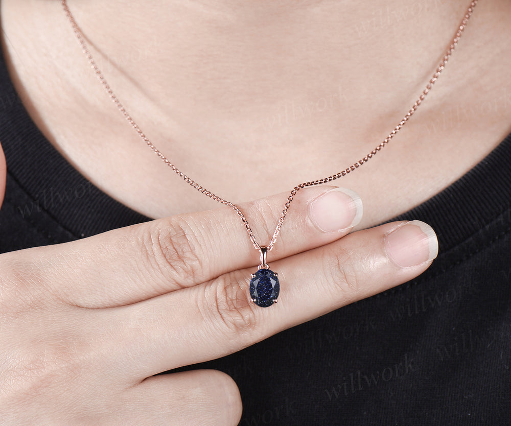 Unique Galaxy Oval Cut Blue Sandstone Necklace Art Deco Healing Blue Gemstone Solitaire Pendant 14k Rose Gold Starry Sky Necklace Birthday Promise Anniversary Necklace Jewelry Gift