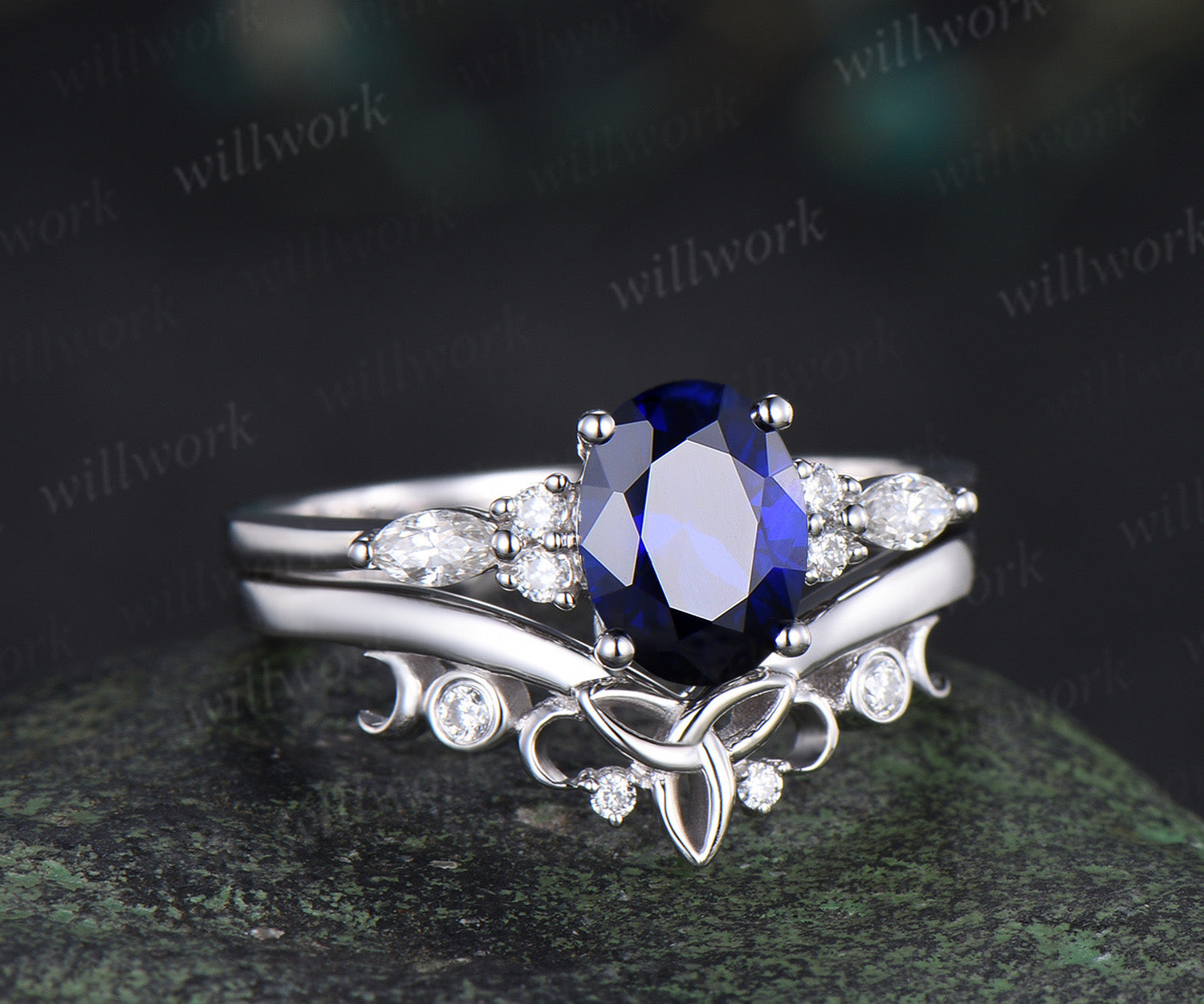 Oval cut blue sapphire engagement ring set seven stone moissanite ring vintage moon women Celtic knot wedding bridal set