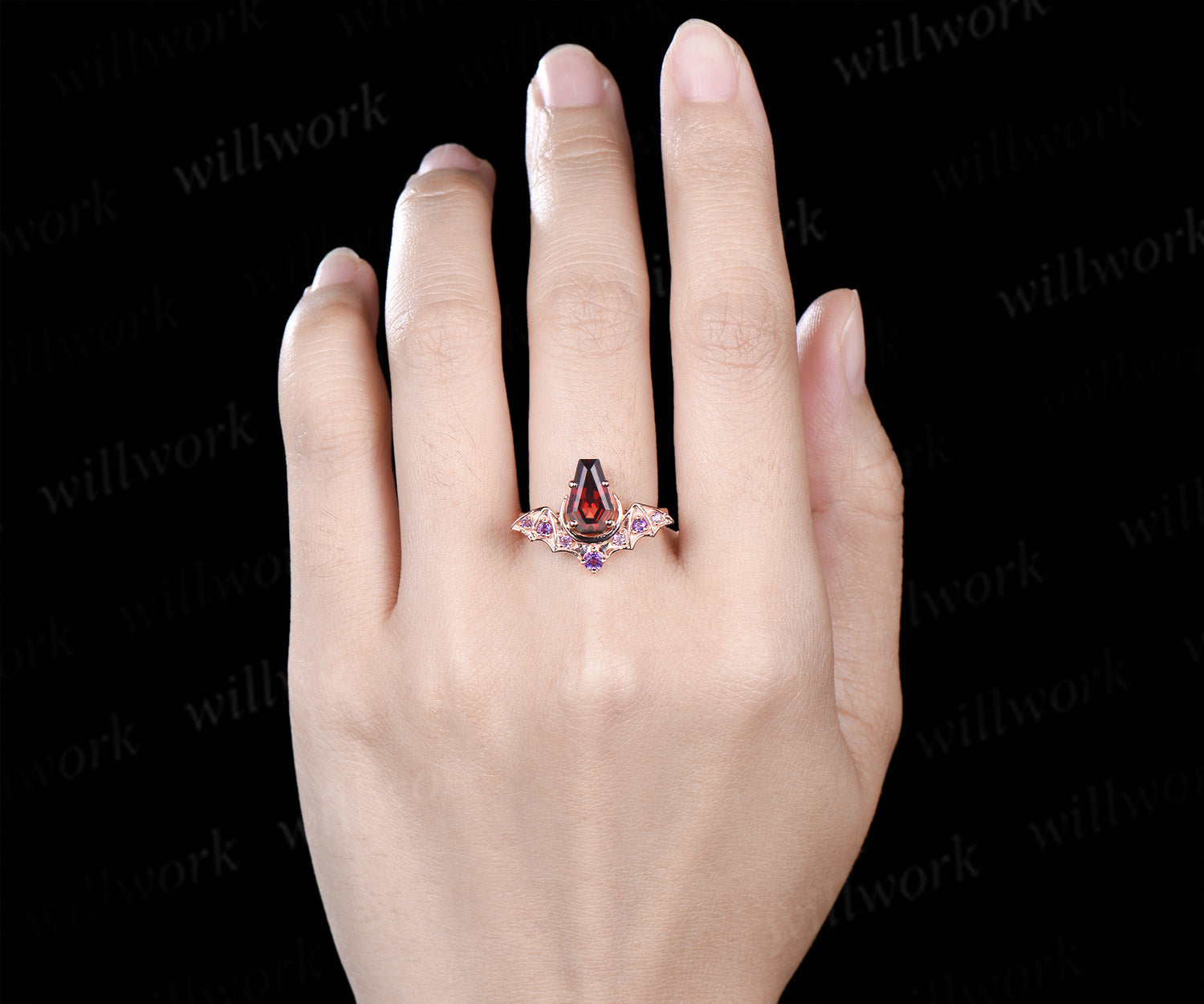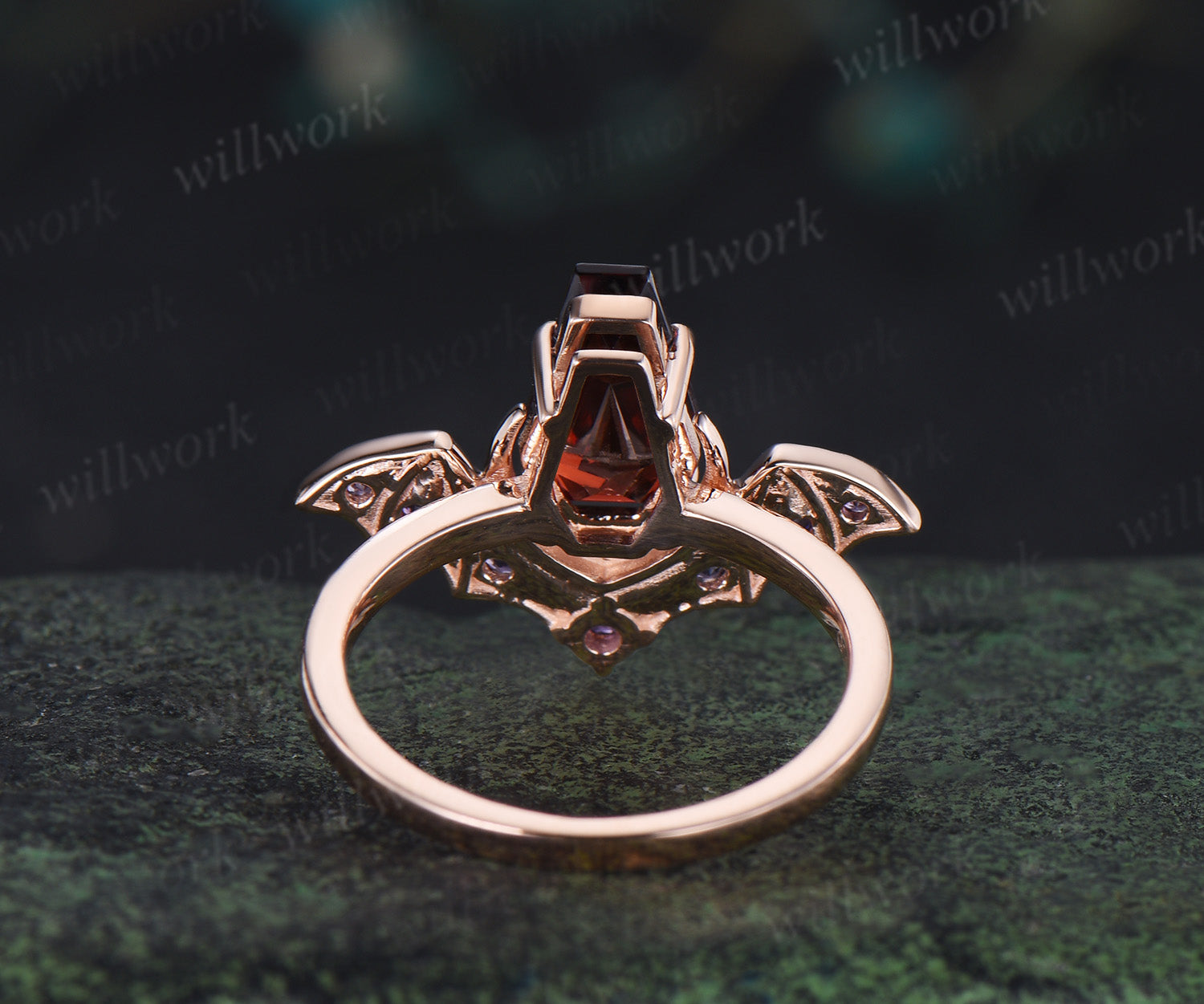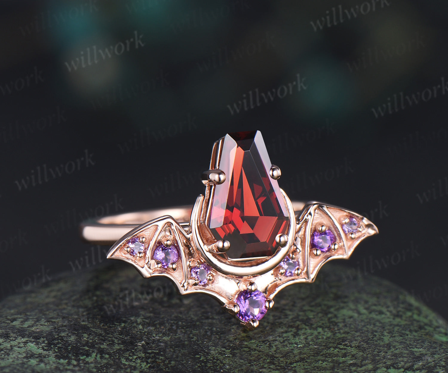 Kite coffin red garnet ring rose gold bat moon wing engagement ring amethyst wedding ring