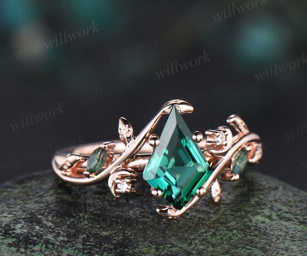 Kite cut emerald ring moon leaf nature inspired engagement ring solid 14k rose gold moss agate wedding ring women Kite cut emerald ring moon leaf nature inspired engagement ring solid 14k rose gold moss agate wedding ring women $265.00