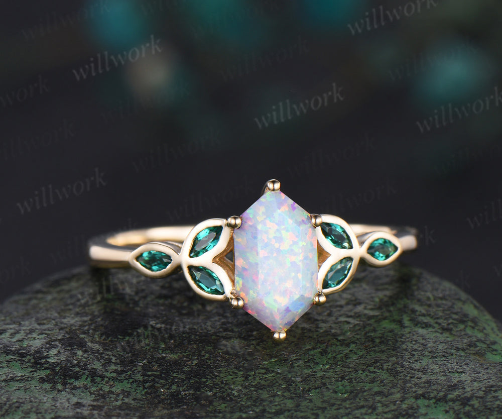 Long hexagon cut white opal ring vintage 14k yellow gold marquise leaf bezel emerald ring antique unique engagement ring women gift