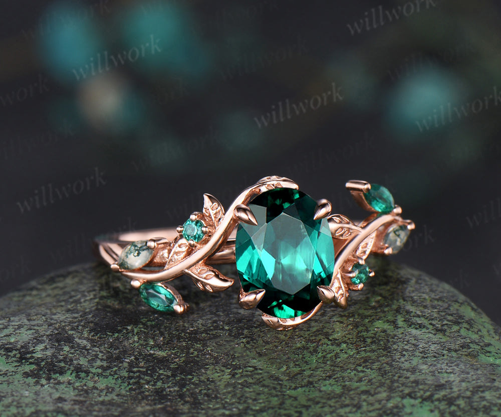 Oval cut green emerald Engagement Ring 14k rose gold leaf moss agate ring vintage Nature Inspired anniversary gift gemstone