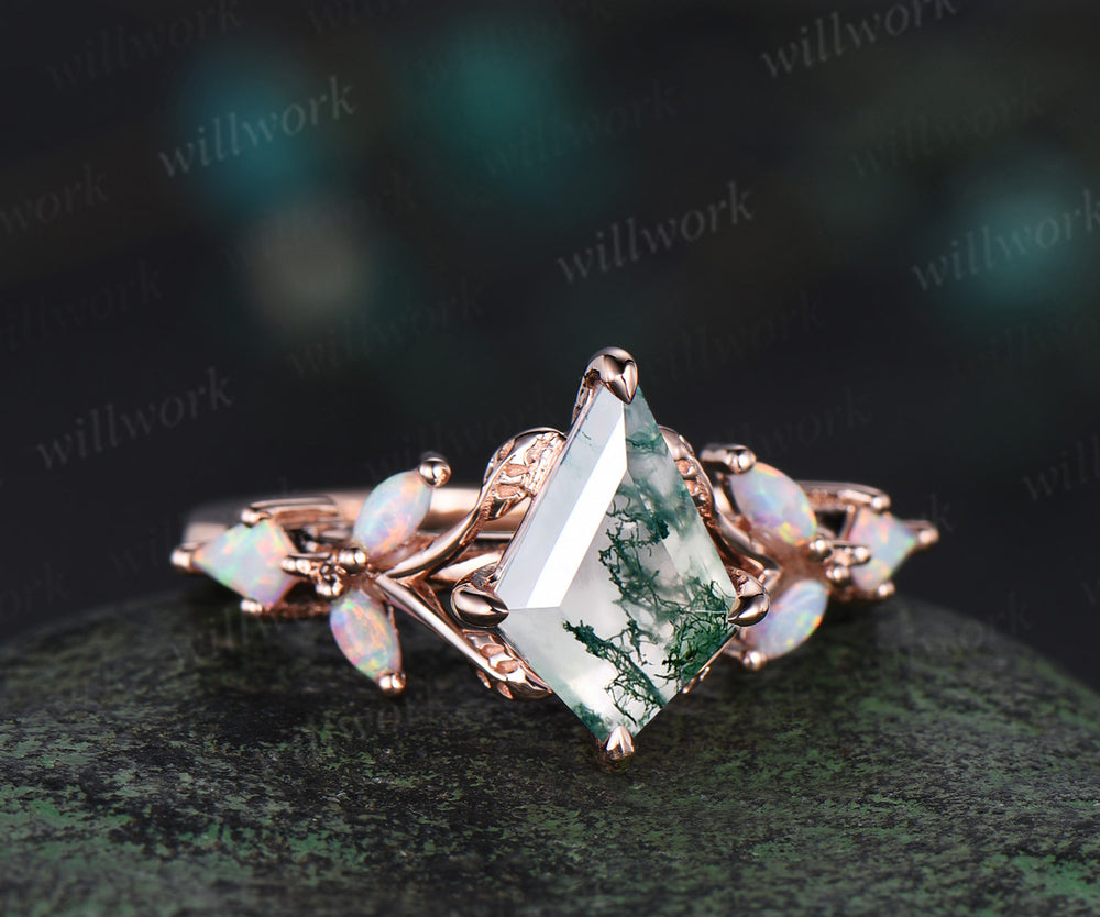 Unique kite cut moss agate engagement ring leaf kite opal ring 14k rose gold art deco promise anniversary gift