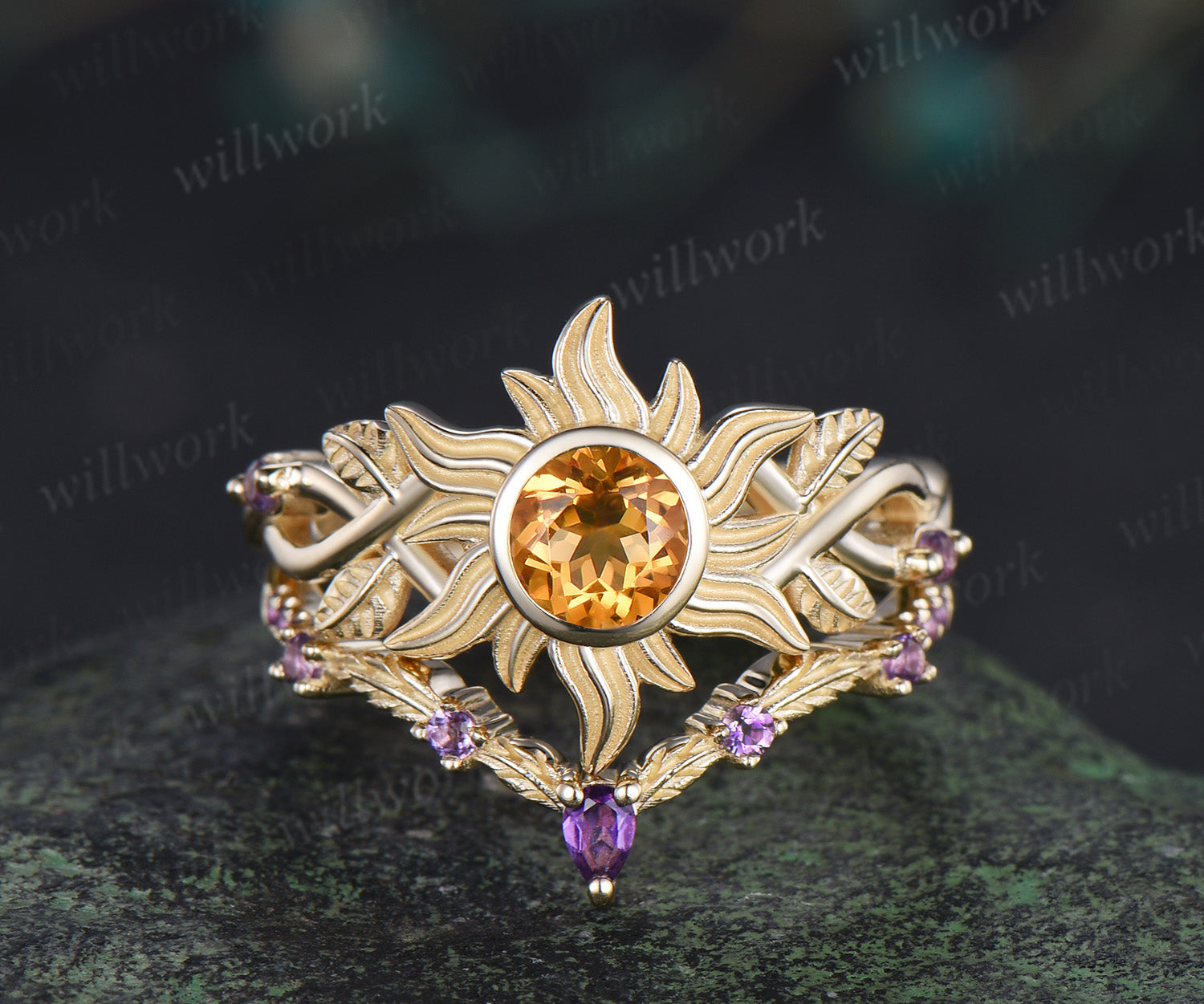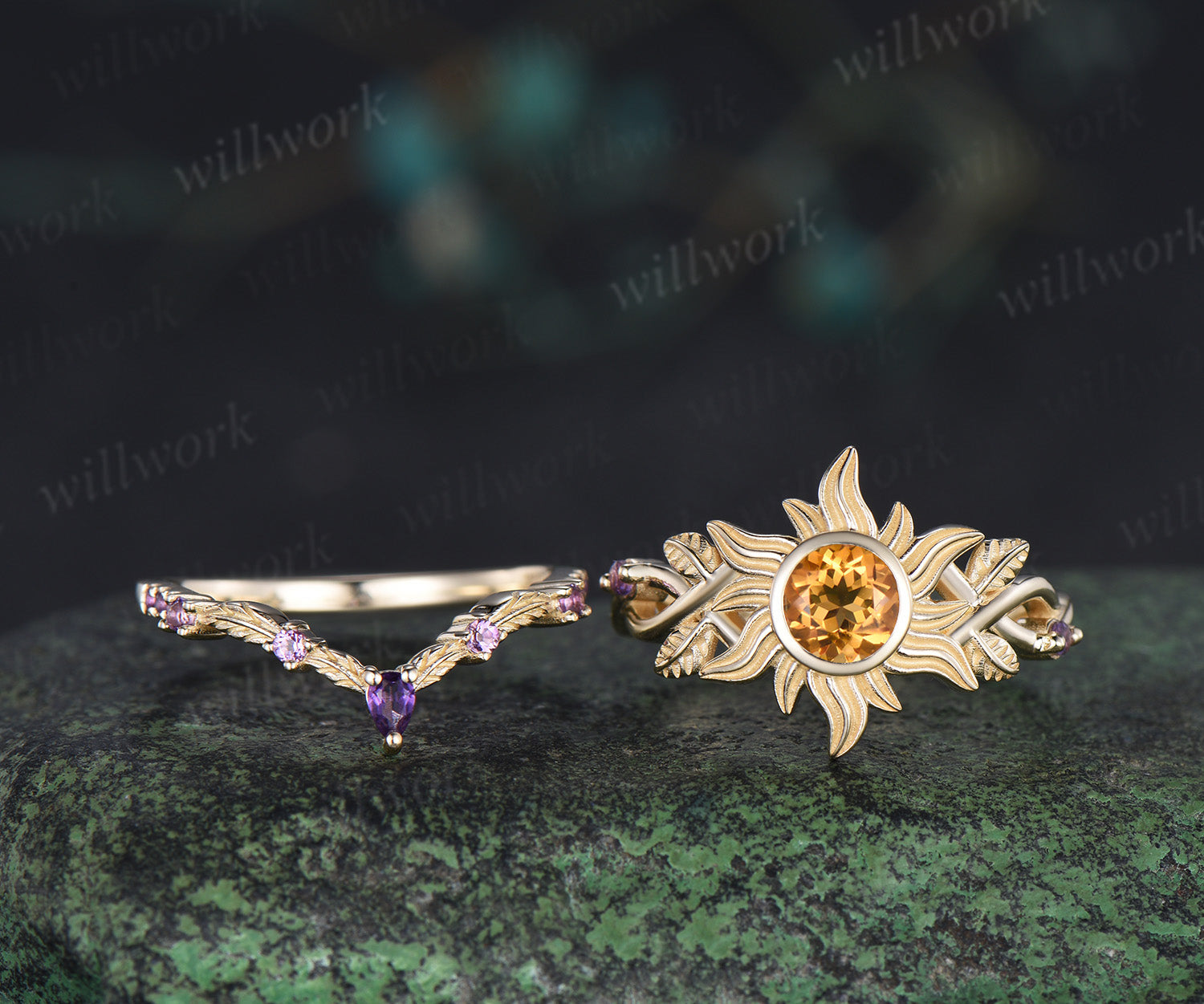 Rapunzel ring sun citrine engagement ring set bezel setting twig vines amethyst ring leaf wedding band unique bridal set