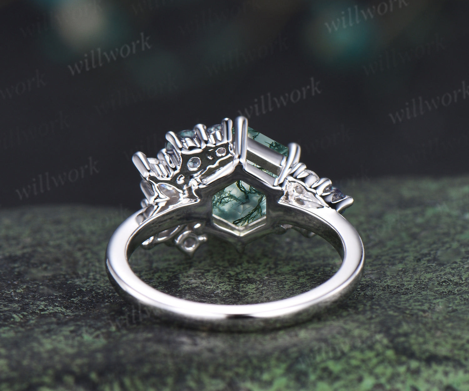Hexagon cut natural moss agate engagement ring cluster alexandrite marquise moissanite promise wedding ring