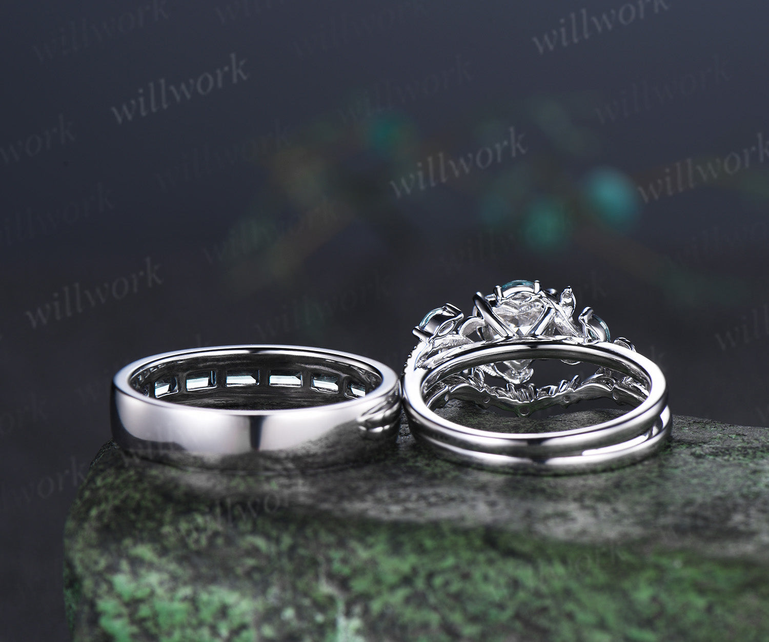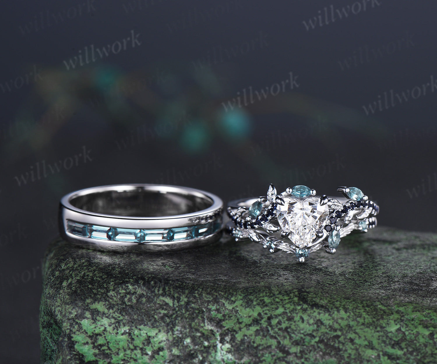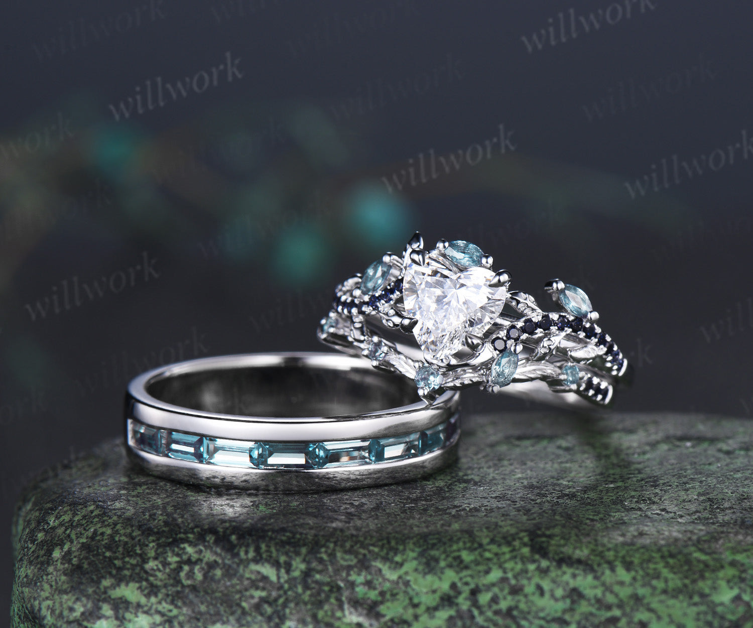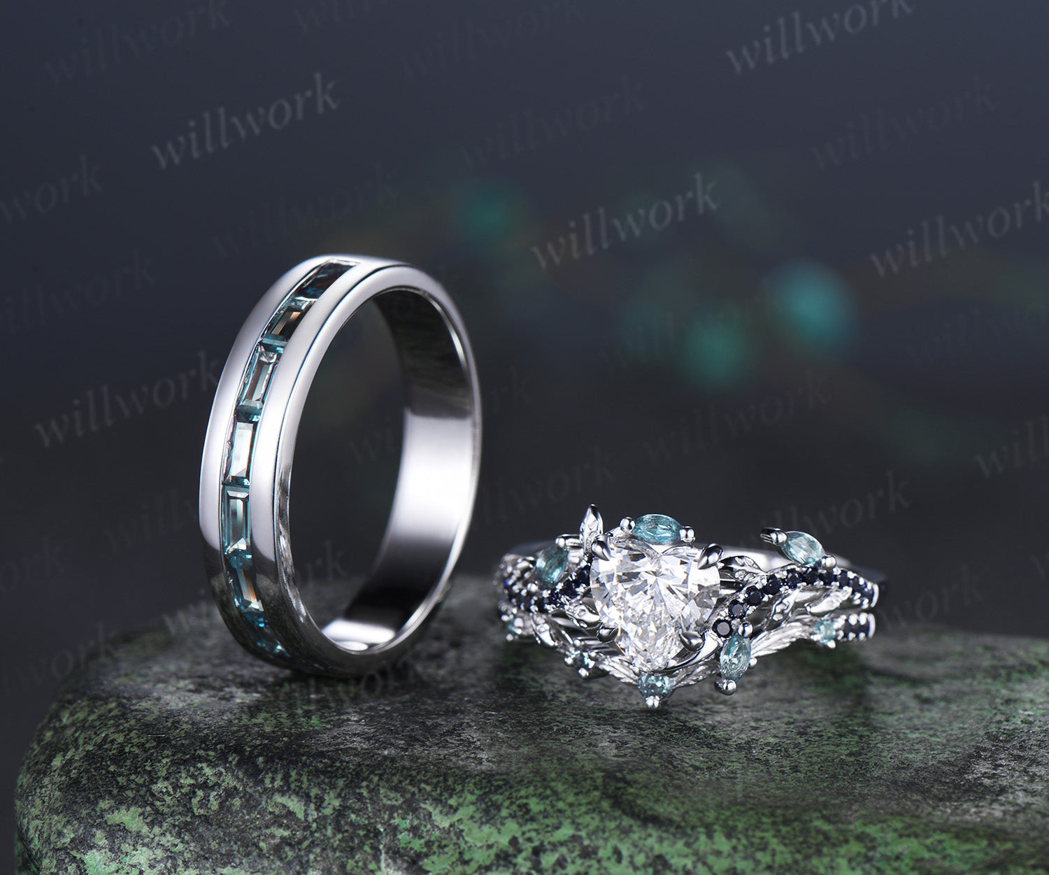 Heart Lab Grown Diamond Leaf Bridal Ring Set & Baguette Alexandrite Half Eternity Men Wedding Ring Nature Inspired Couple Ring Set