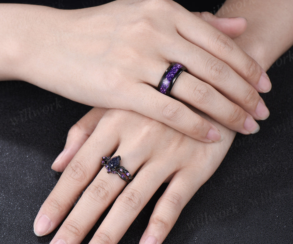 ***Like stardust caught in twilight, this galaxy-inspired couple ring set features a teardrop blue sandstone center stone that shimmers like the night sky. Paired with leaf-accented amethysts and a tungsten men?¡®s band inlaid with violet fragments, it?¡®s a dreamy symbol of cosmic love.***