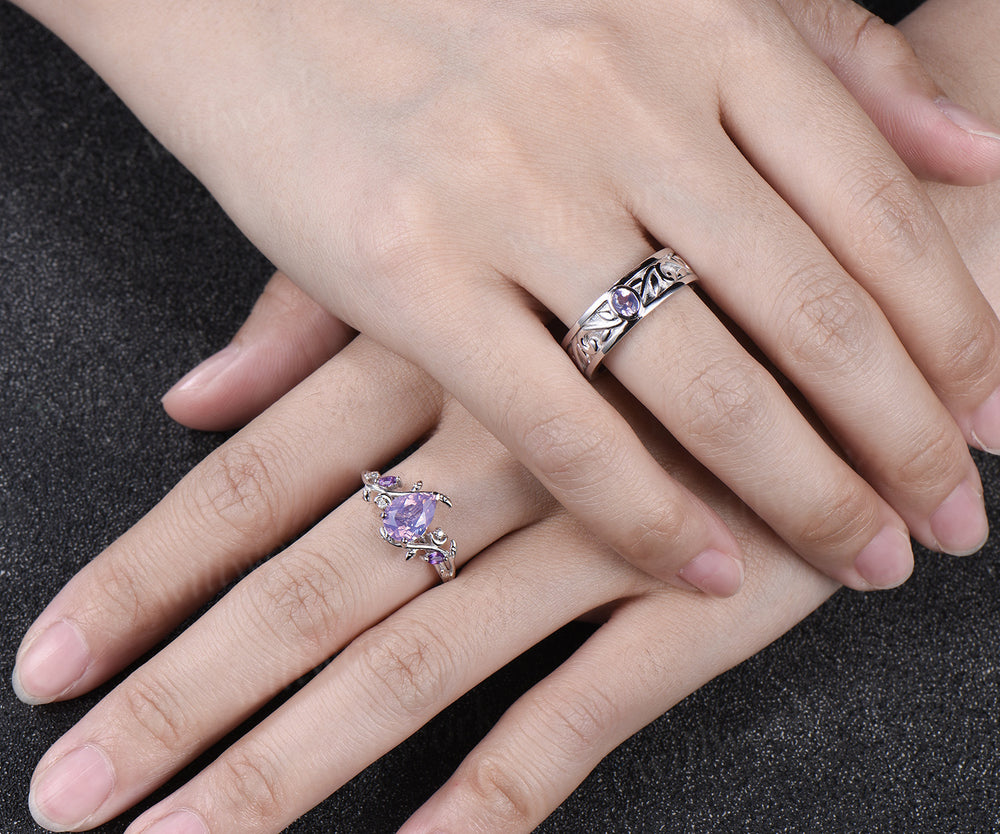 ***Like a moonlit stroll through an enchanted forest, this his and her couple ring set blends whimsy with romance. A pear cut lavender amethyst shines amid delicate moon and leaf motifs, paired with a men?¡®s band etched in natural twigs over Lavender amethyst?acrafted to echo your forever love story.***- Metal: Solid gold(10K/14K/18K white/yellow/rose gold),925 sterling silver,platinum available