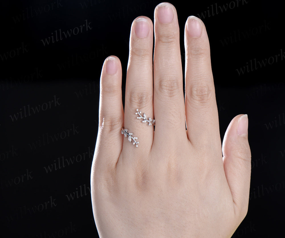 Leaf diamond wedding band enhancer wraps solid 14k white gold cluster double open gap wedding ring women unique anniversary gift