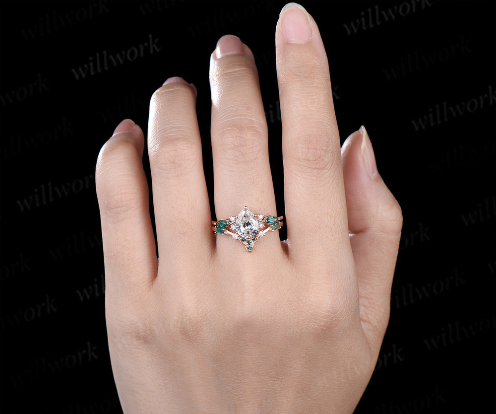 Pear lab IGI grown diamond ring set vintage seven stone ring trinity knot baguette emerald wedding Band 2pc bridal set