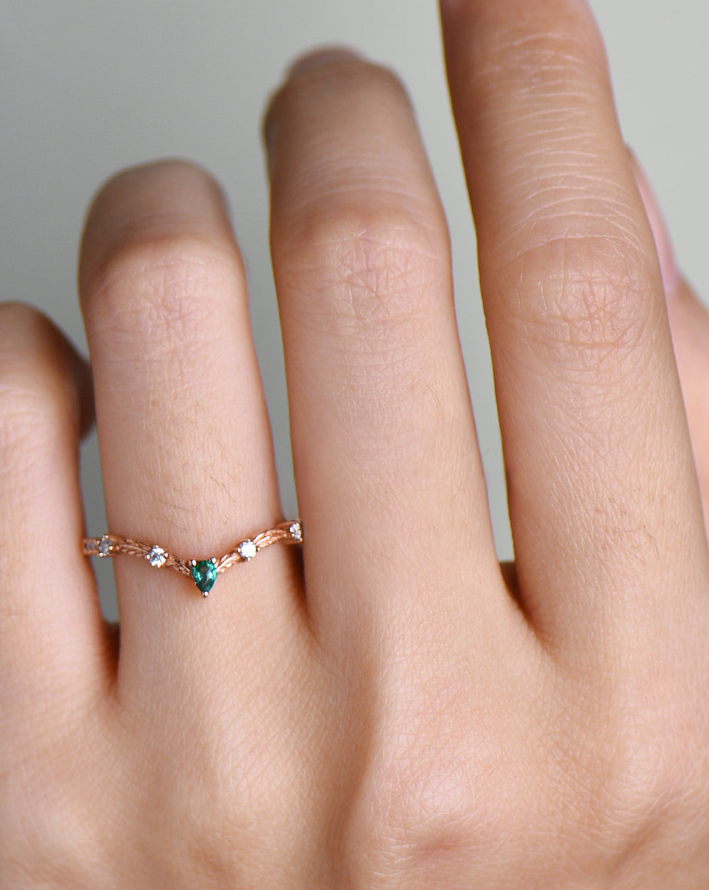 Vintage pear emerald diamond wedding band solid 14k yellow gold art deco leaf nature inspired stacking bridal anniversary ring women gift